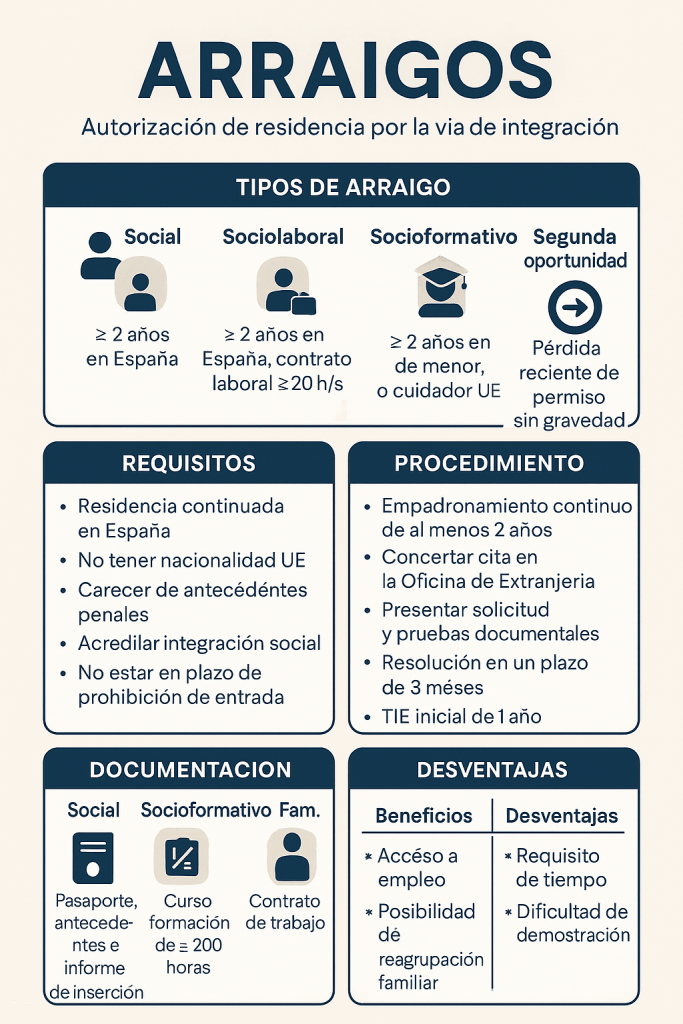 1. Social: Contrato laboral, arraigo social (informe del ayuntamiento) ≥ 2 años Muy utilizado por personas sin contrato anterior.